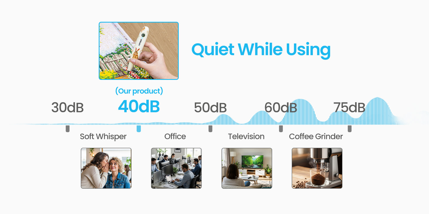 Enjoy the calm while you create! The diamond painting pen runs at just 40 dB, so you can focus on your artwork without any noisy distractions.