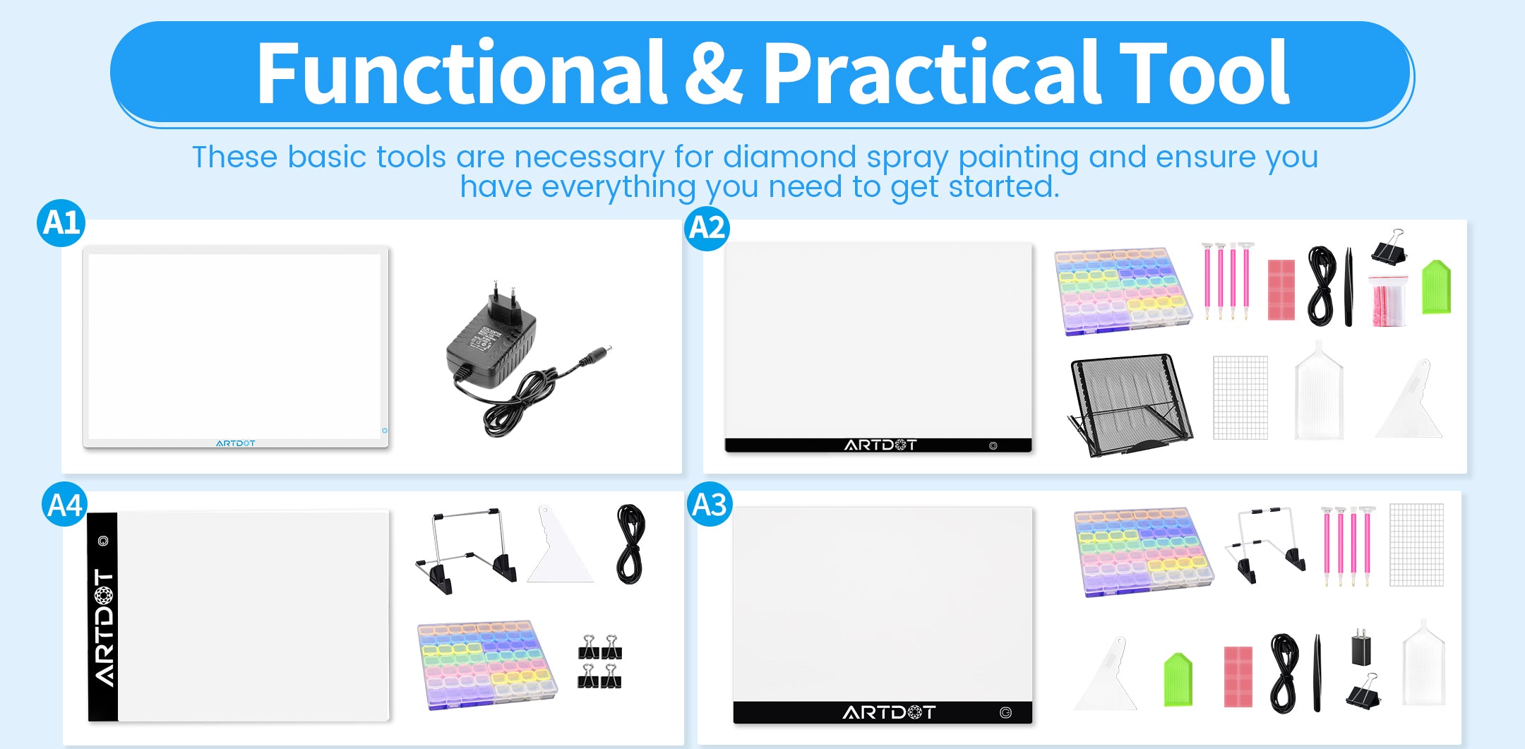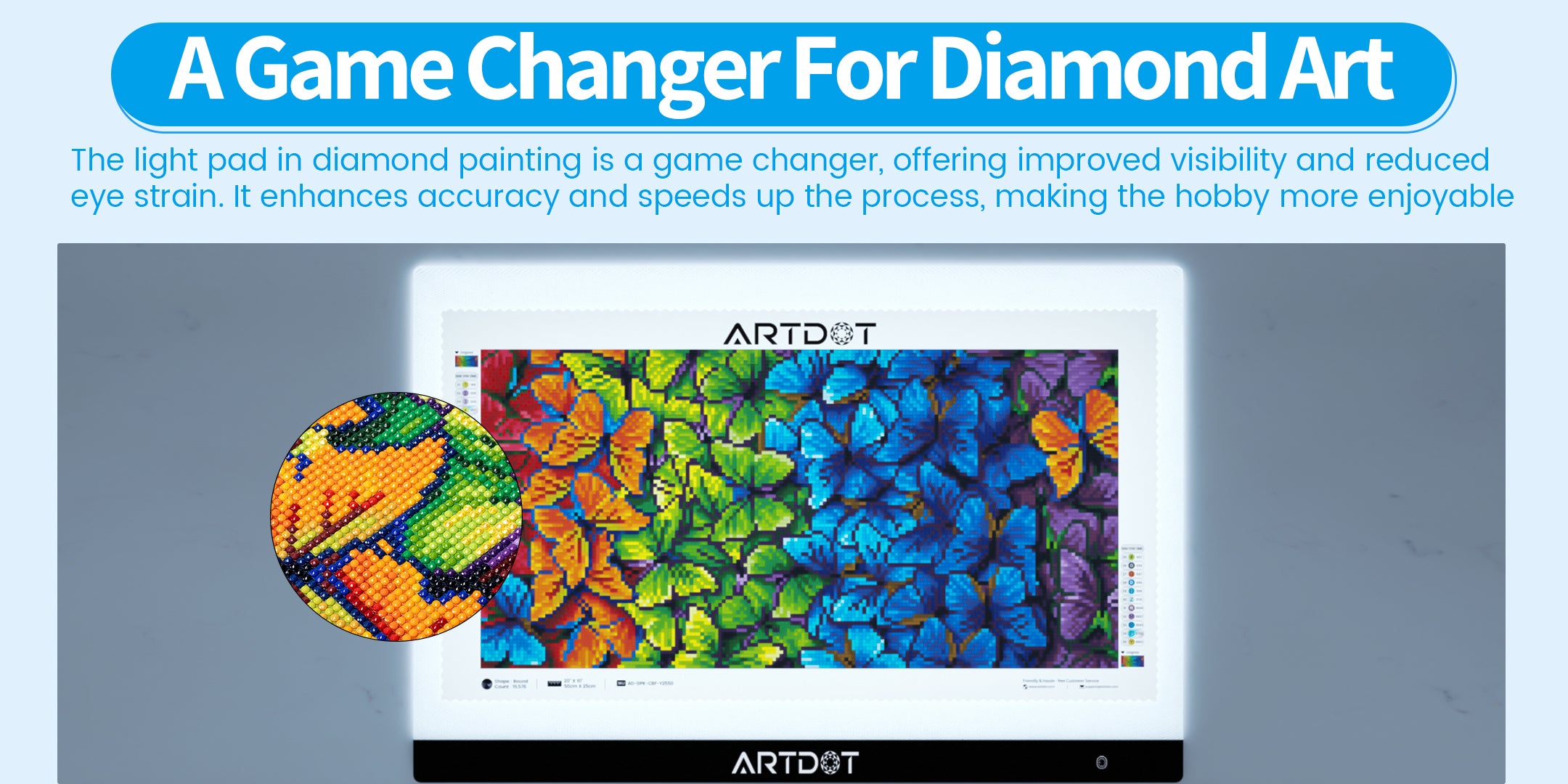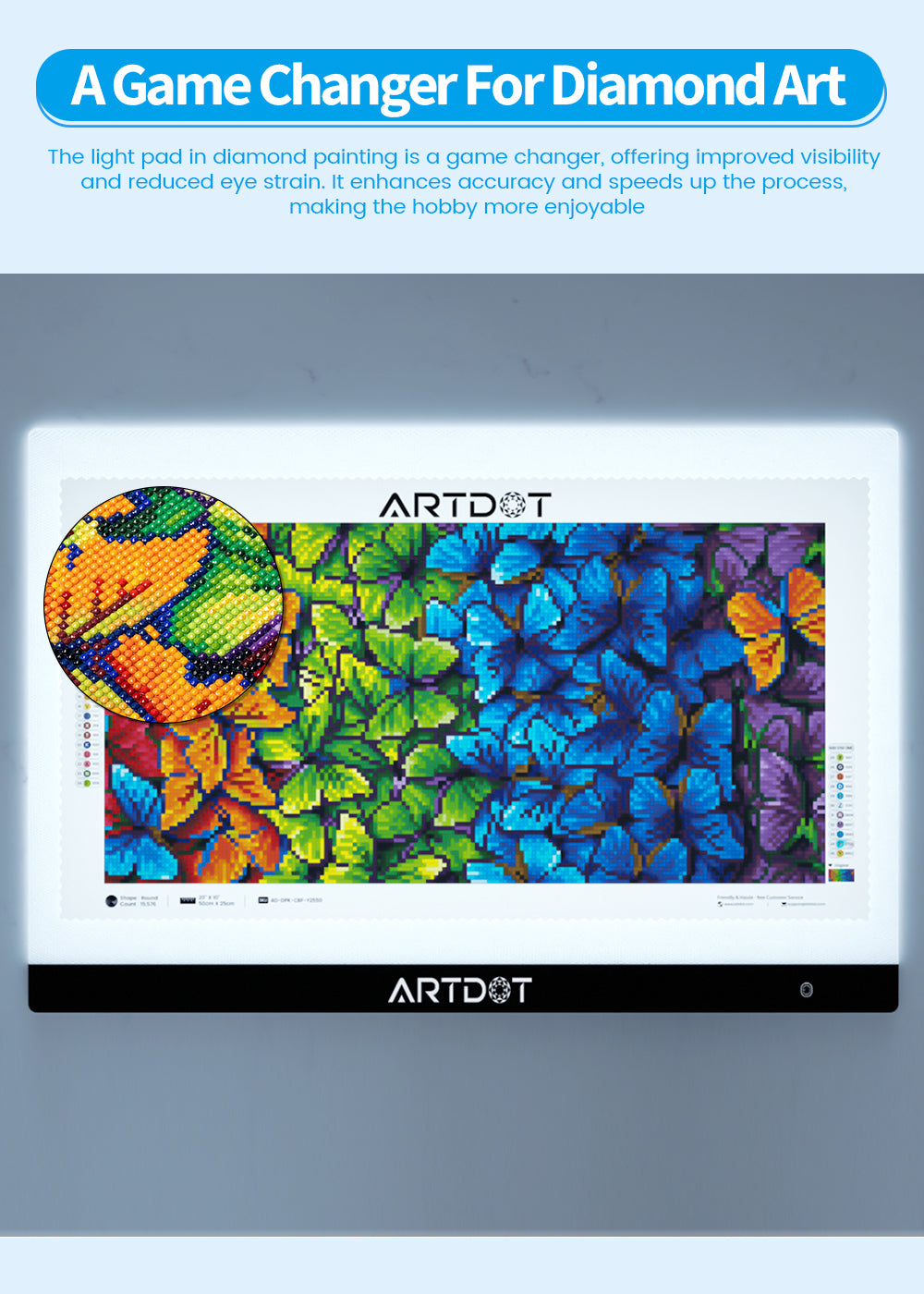 Almohadilla de luz ARTDOT tamaño A2, una herramienta imprescindible para los entusiastas de la pintura con diamantes. Este práctico dispositivo ilumina su lienzo desde abajo, mejorando la visibilidad de símbolos y detalles.