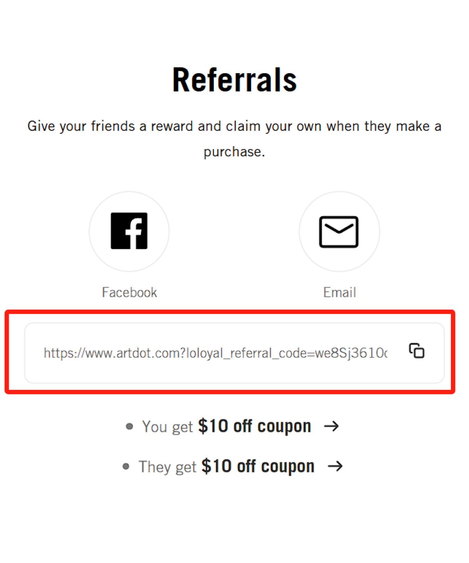 Accedi al tuo account Artdot e prendi il tuo link di referral unico dalla pagina del programma di referral.