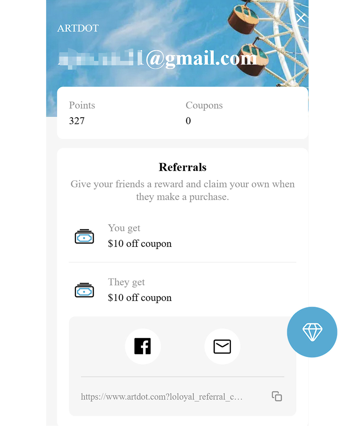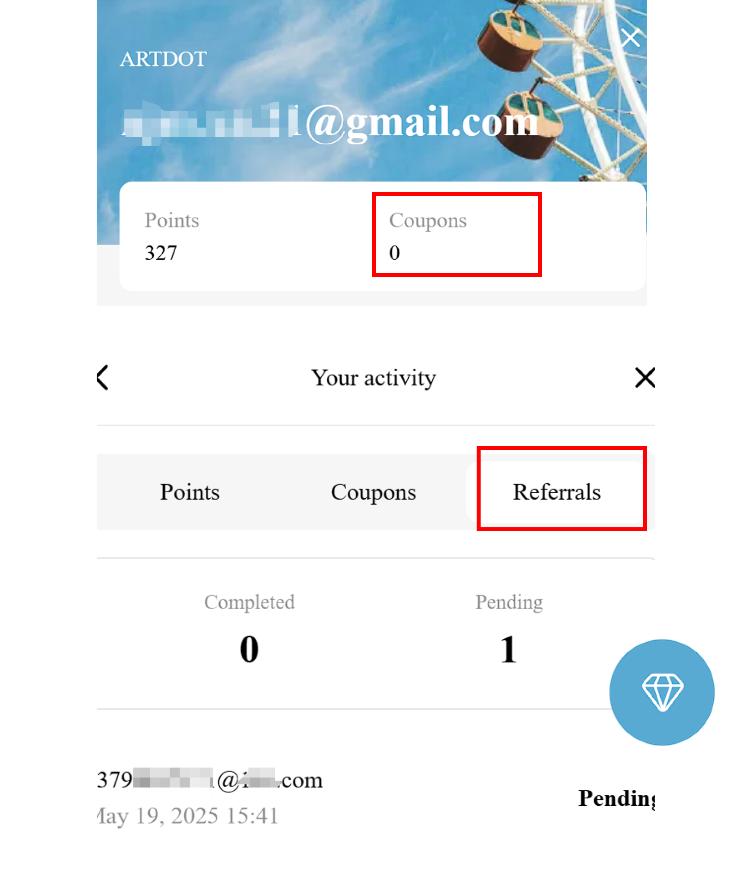 Il tuo amico utilizza il loro codice per effettuare un acquisto con successo per la prima volta. - Puoi anche verificare lo stato dei tuoi referral attraverso il nostro programma fedeltà. Clicca semplicemente sull'icona del diamante nell'angolo in basso a destra della pagina e vai al pannello dei coupon.