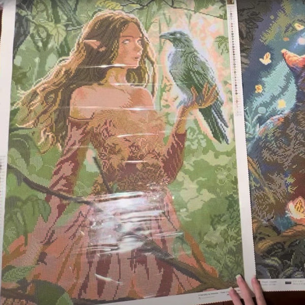 Within the enchanted wood, a seer seeks answers through her crow. The creature becomes her eyes and ears, a feathered familiar. She knows everything, yet keeps the secrets. Learn more about this diamond painting kit licensed by Louise Goalby: